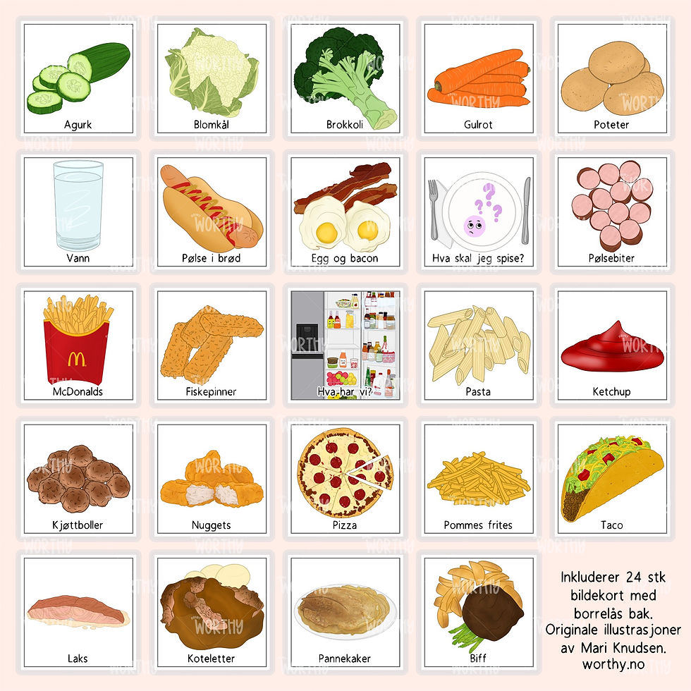 Bildekort er kjernen av WorthyWords systemet. De aller fleste hjelpemidlene er designet slik at man kan bruke de sammen med bildekortene. Bildekort selges også i pakker her.